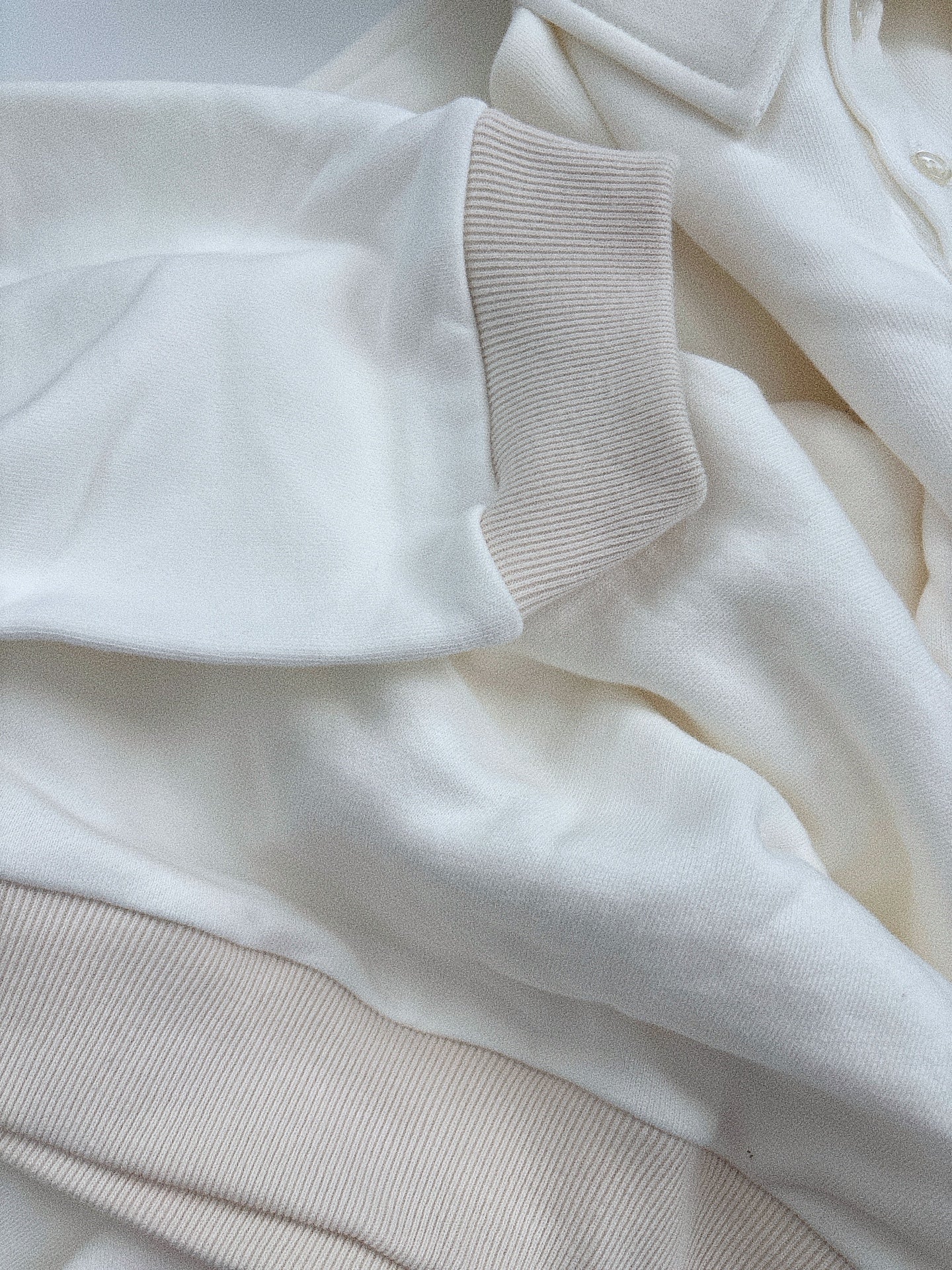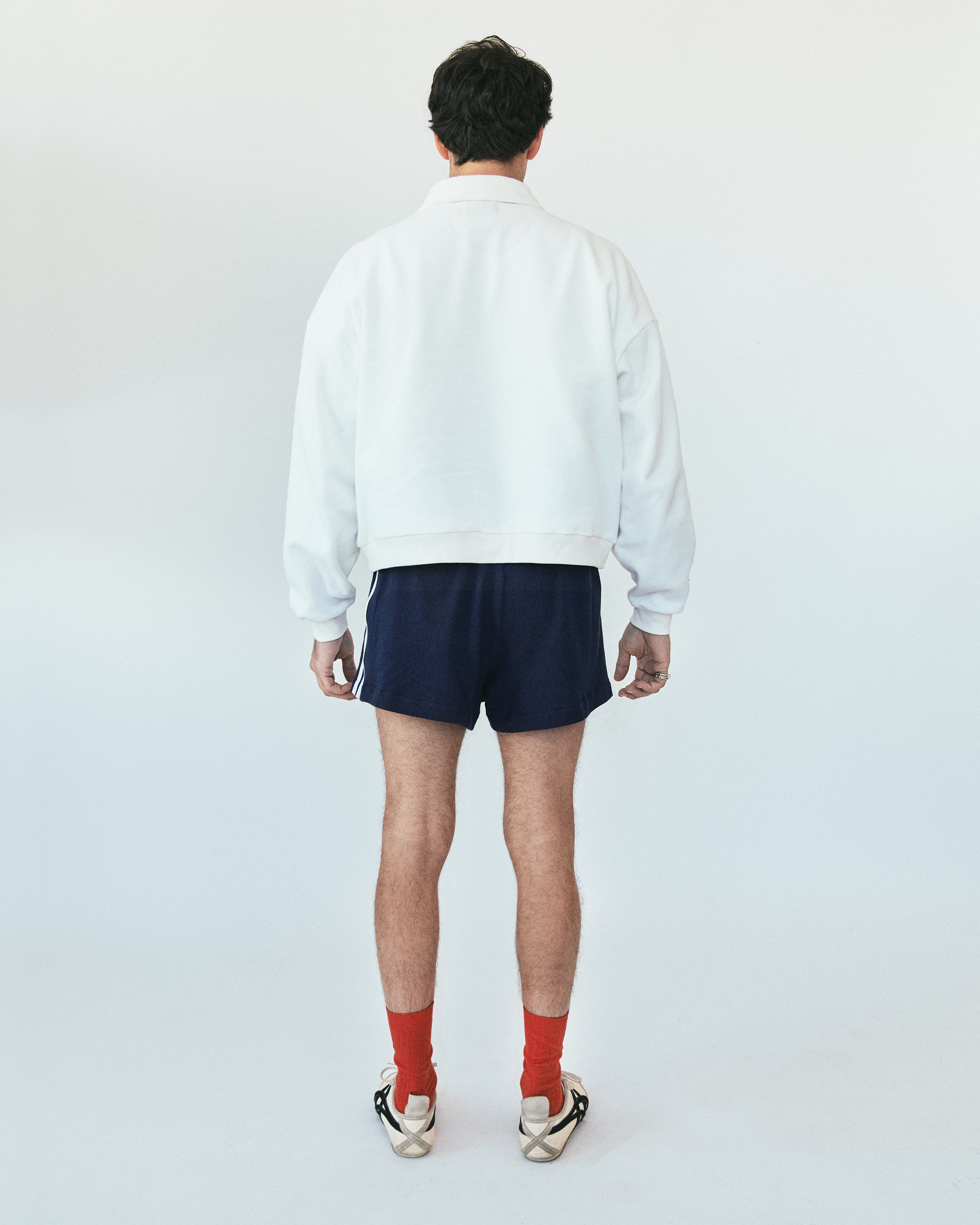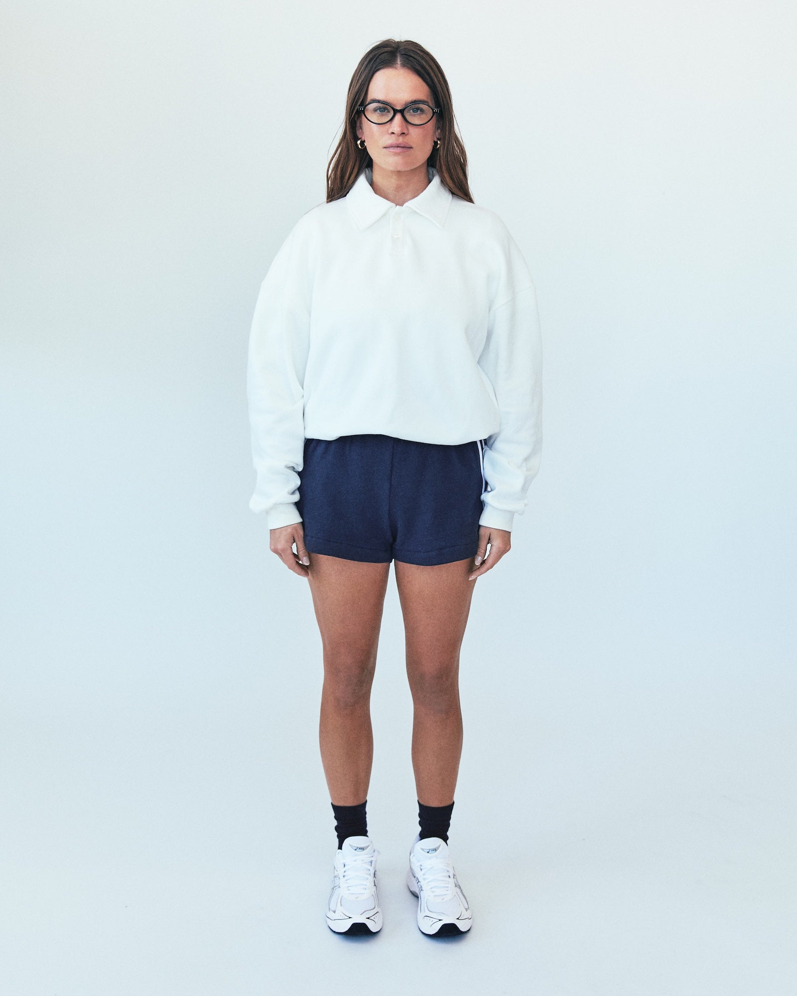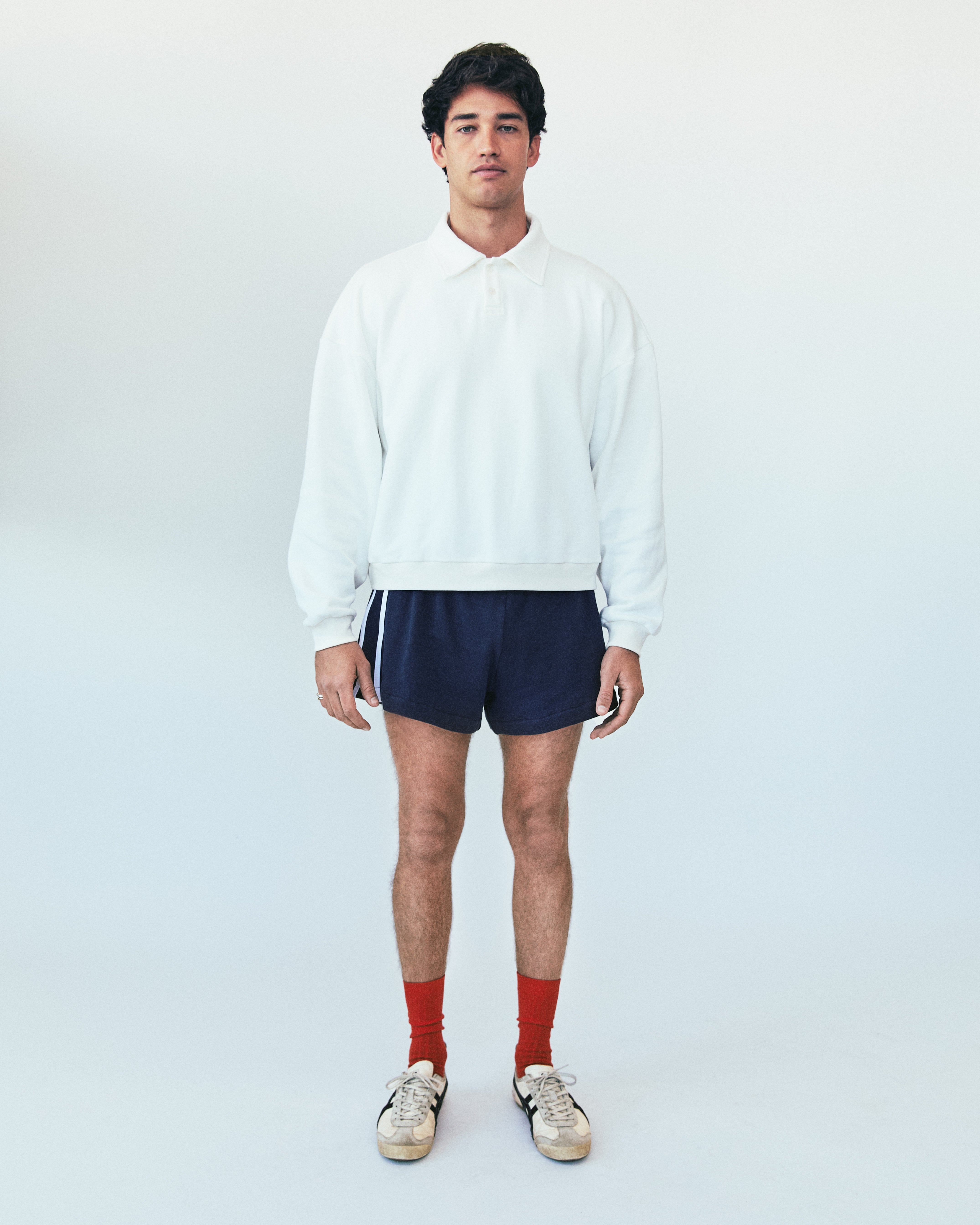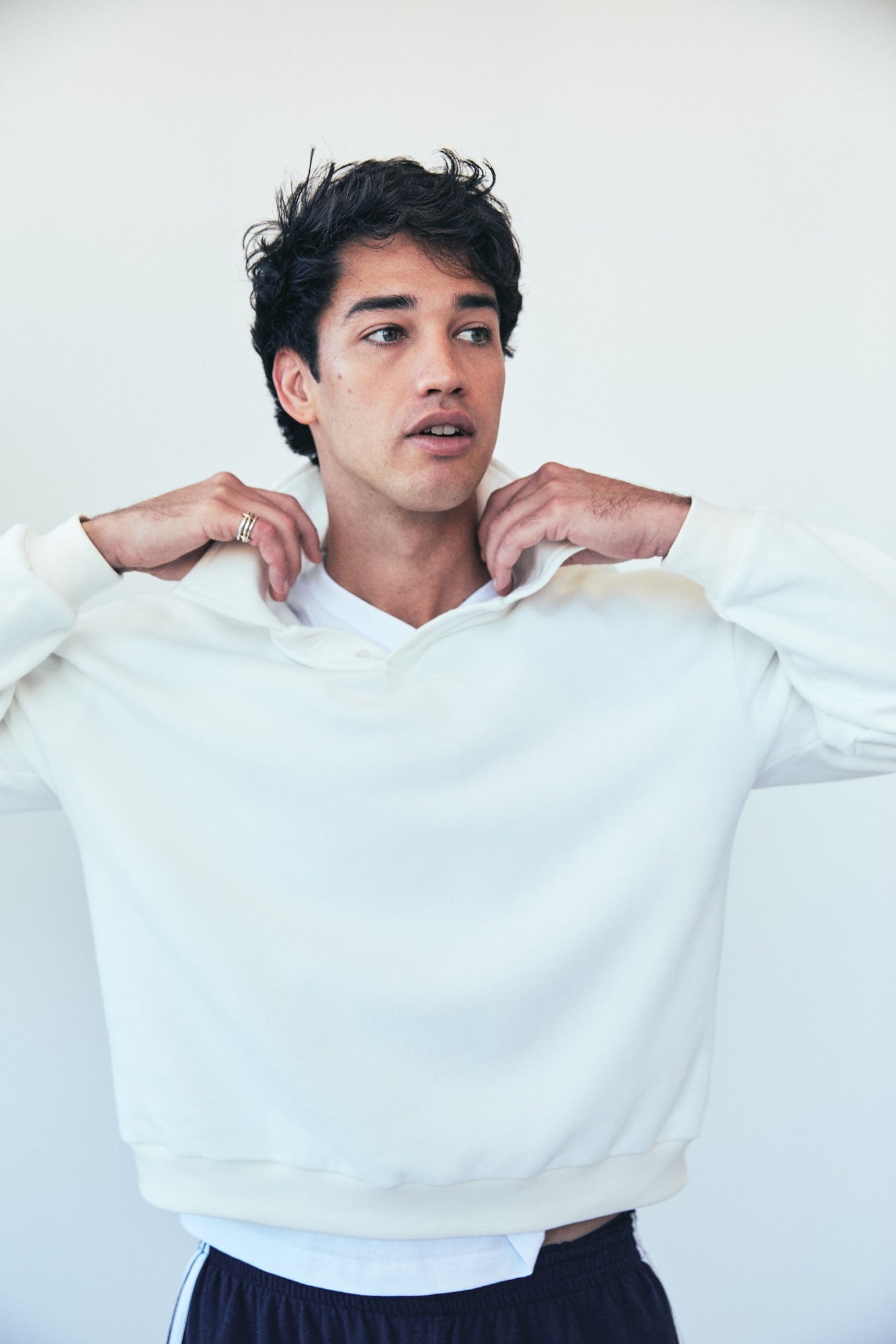 An oversized polo sweatshirt with roomy sleeves, a high neck, and contrasting cream cuff details. Made in Los Angeles from 100% Oeko-Tex certified organic cotton body fabric and 100% cotton rib knit trims. Designed with an easy boxy fit to facilitate movement, sweat, and ventilation.