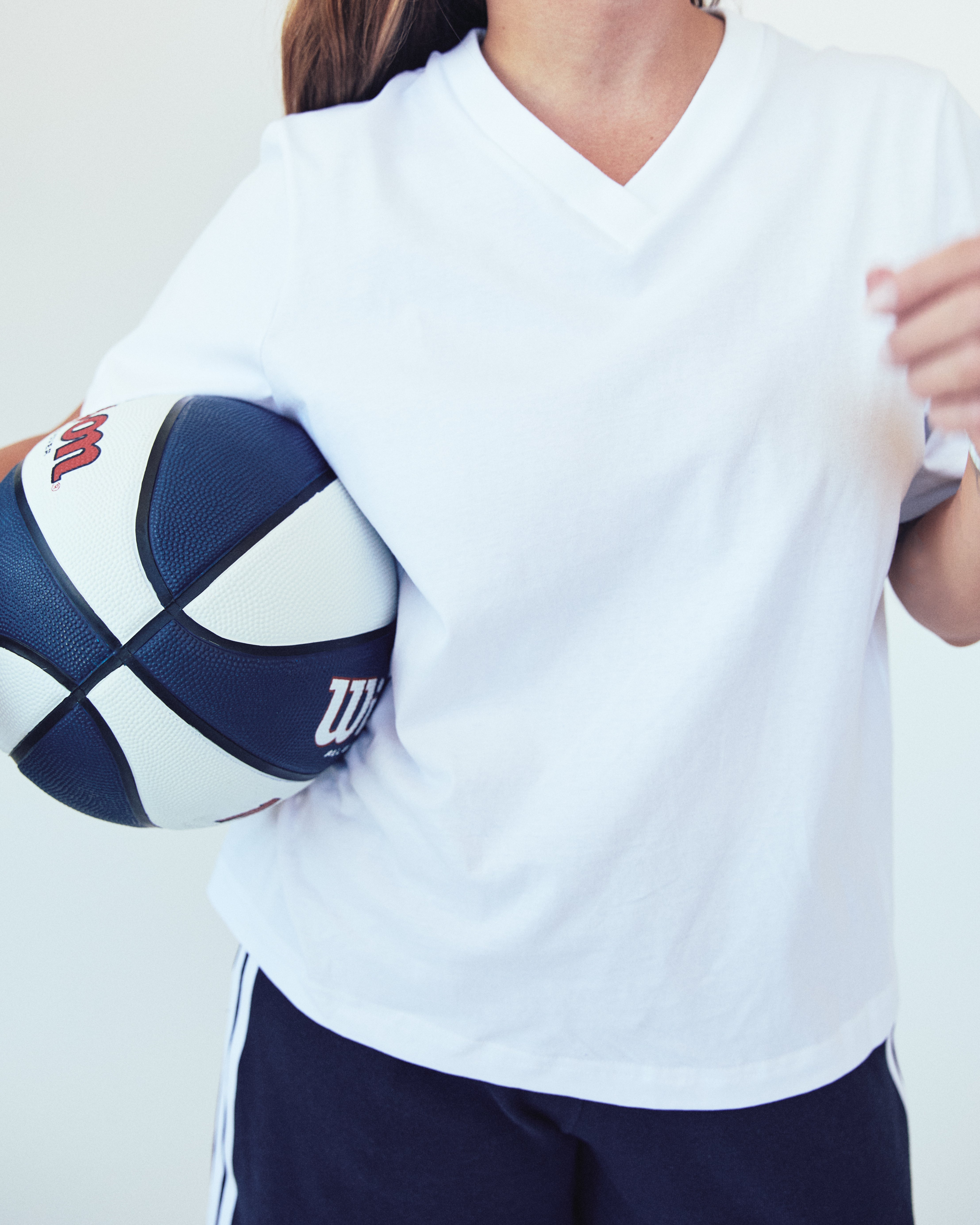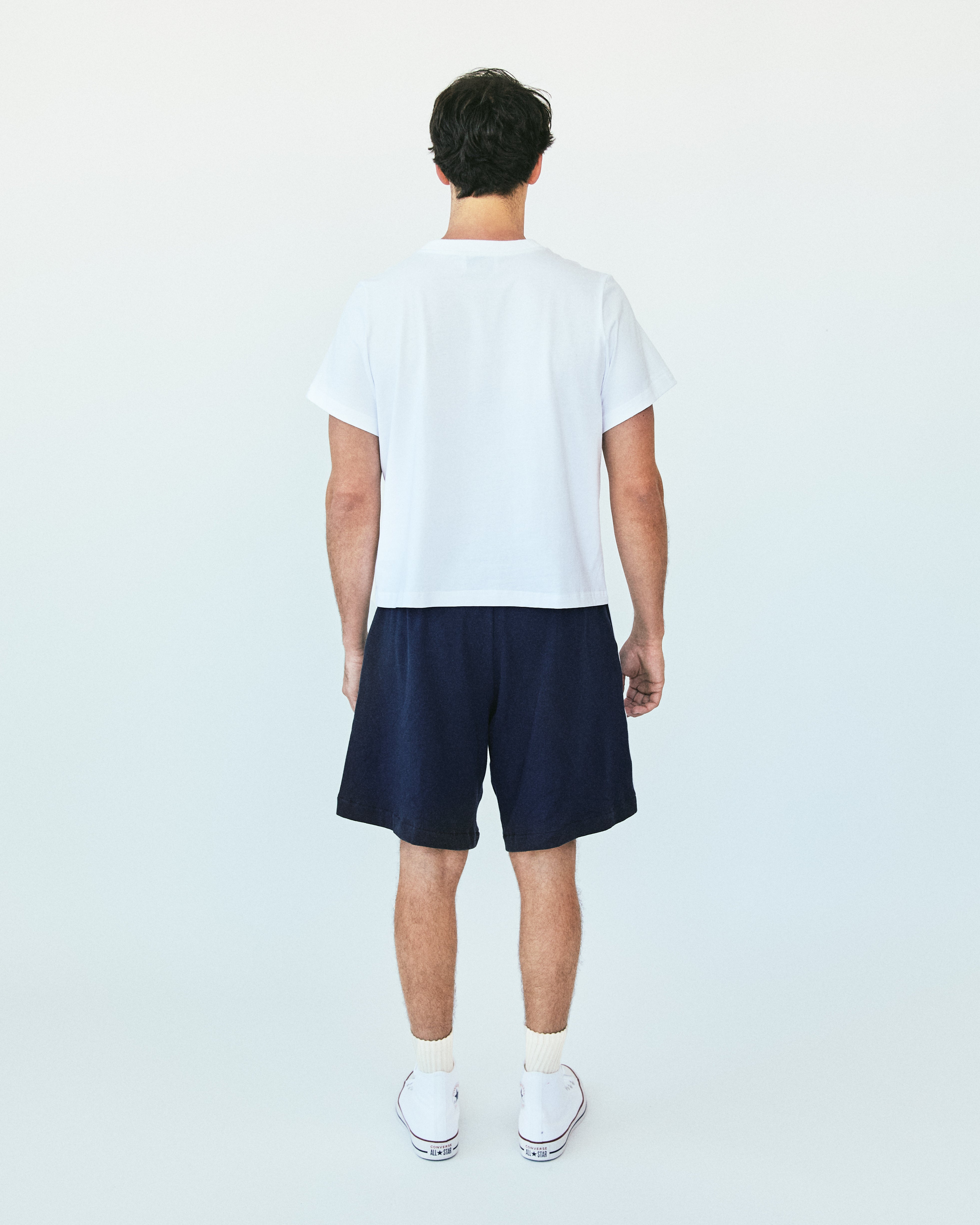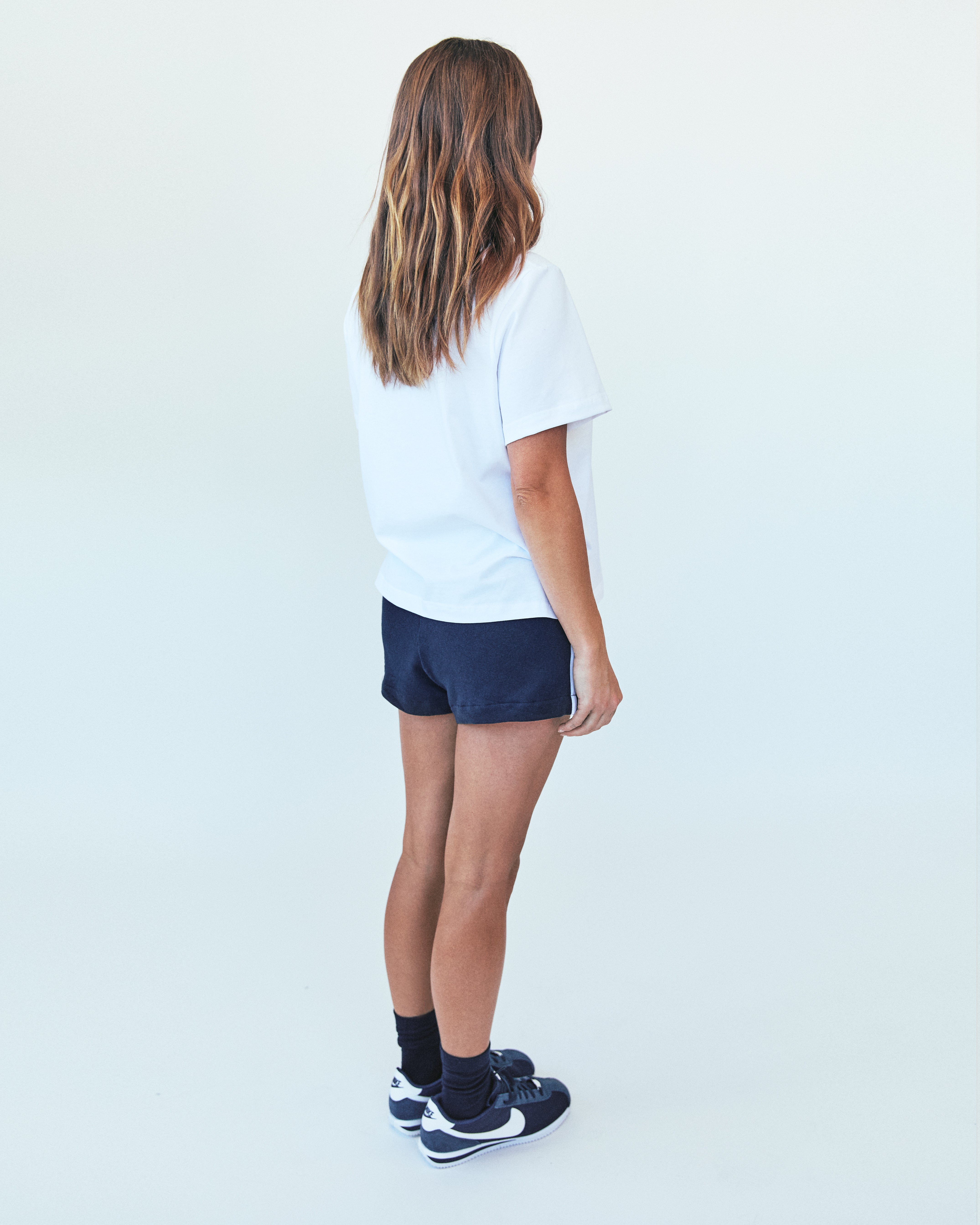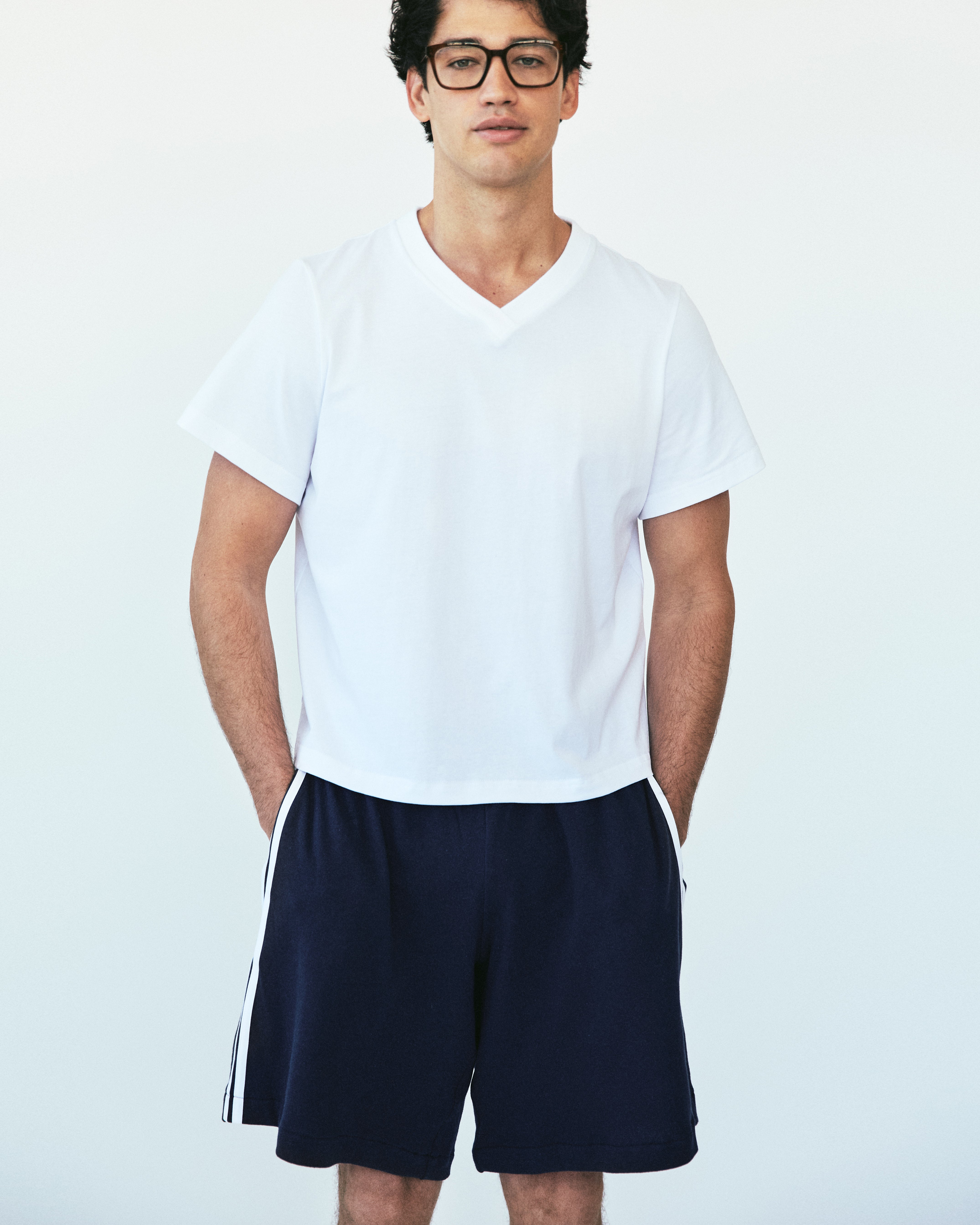 The essential workout tee with a high v-neck and slightly cropped, boxy cut. Made in Los Angeles from 100% organic cotton jersey with a medium weight that moves with you.