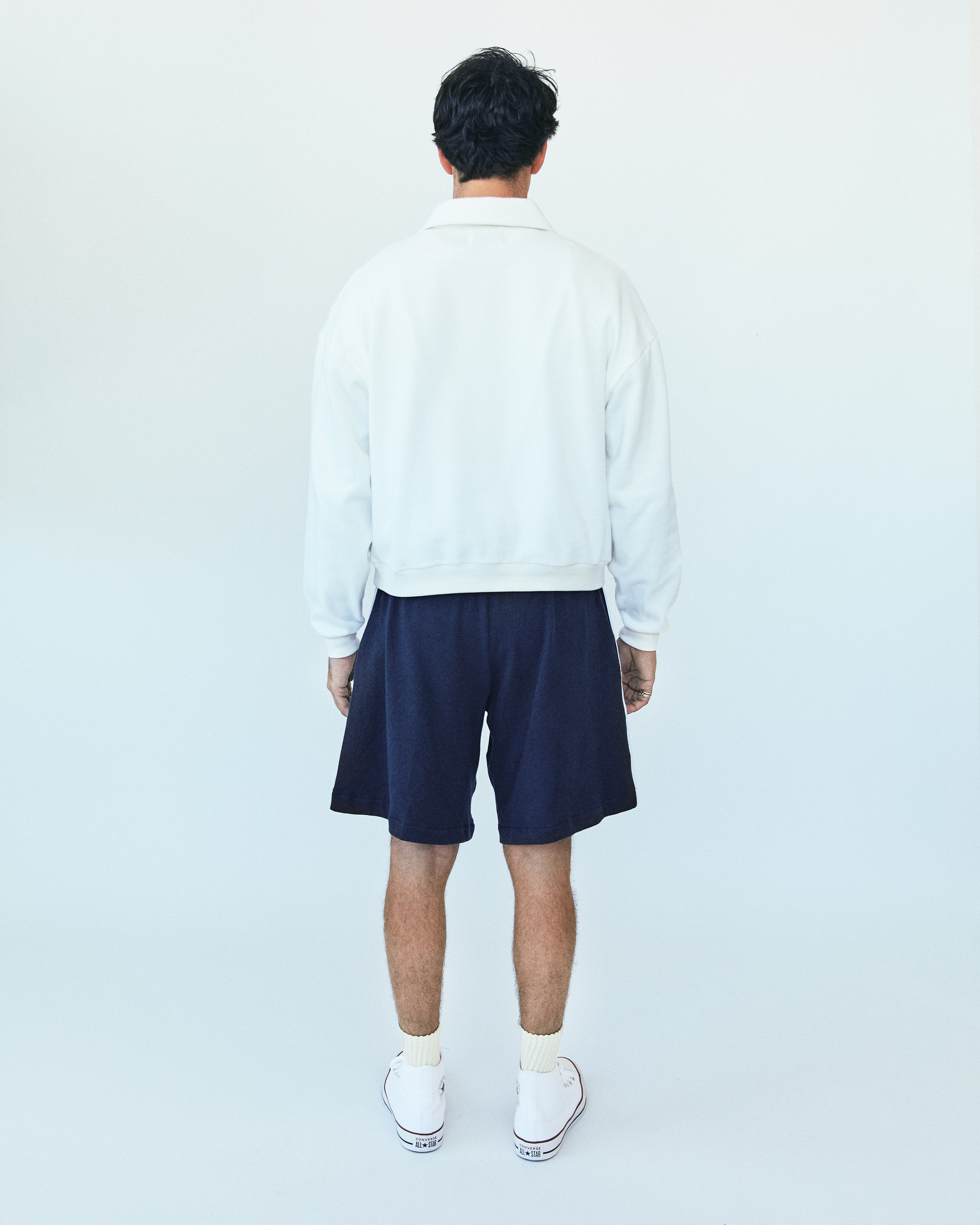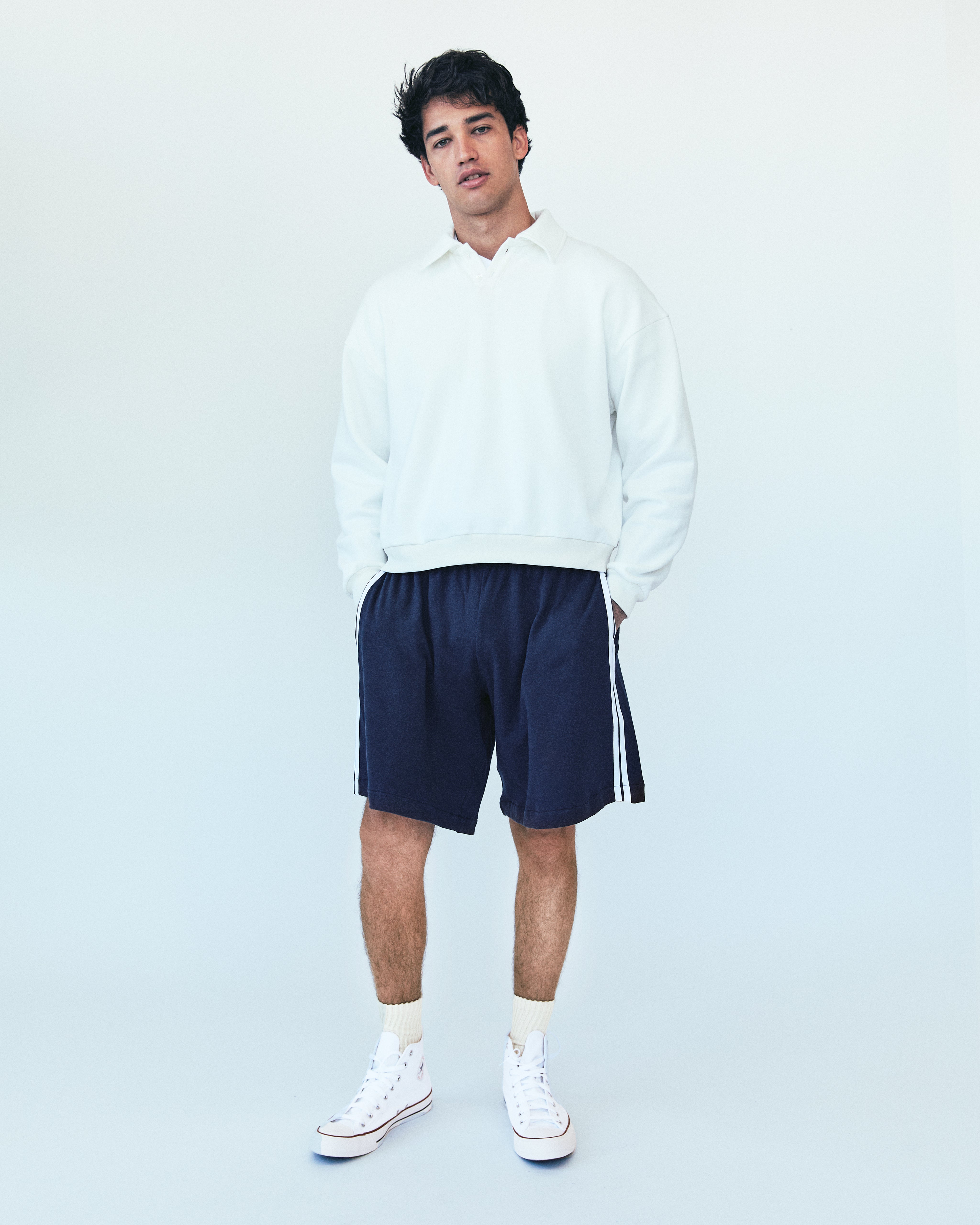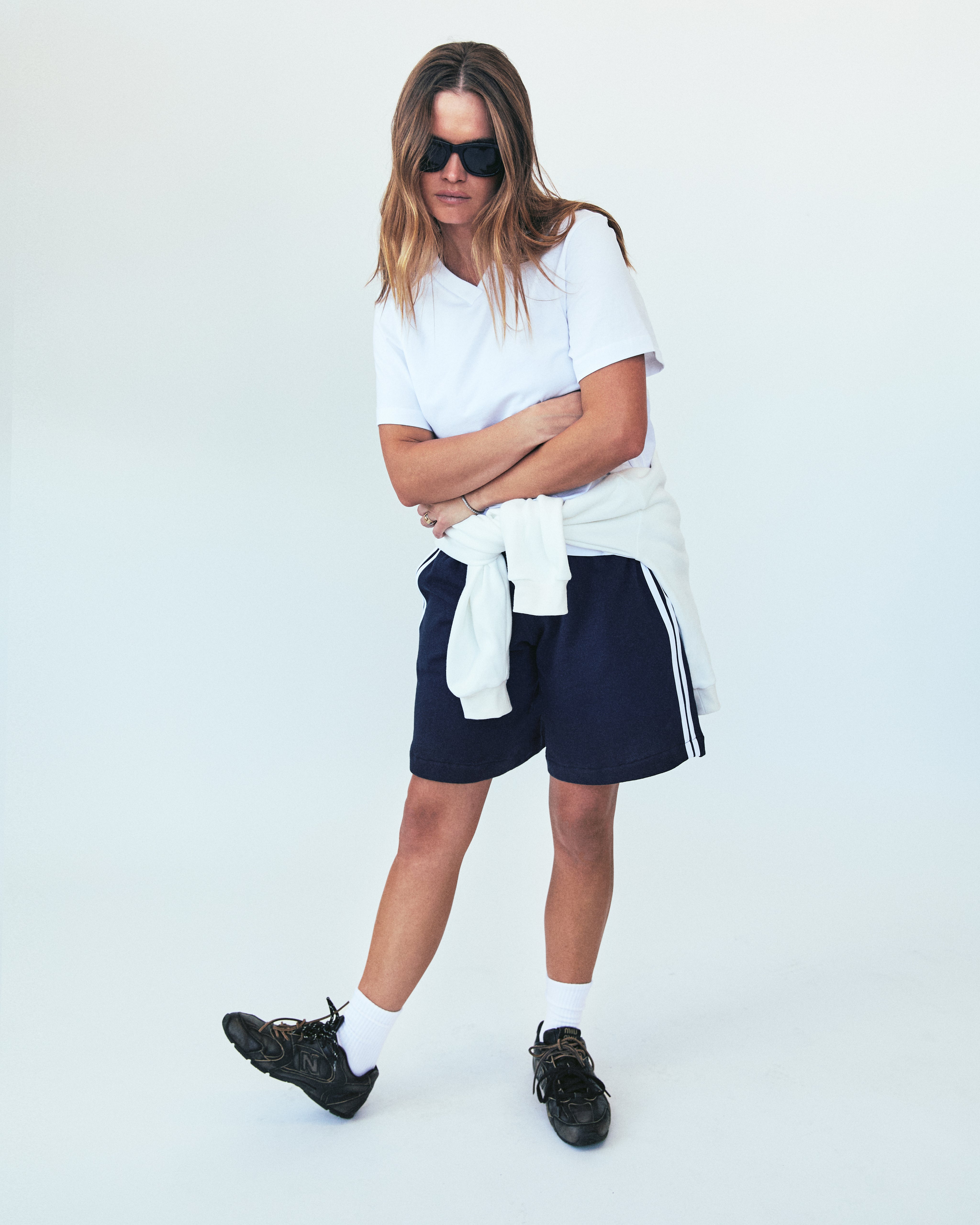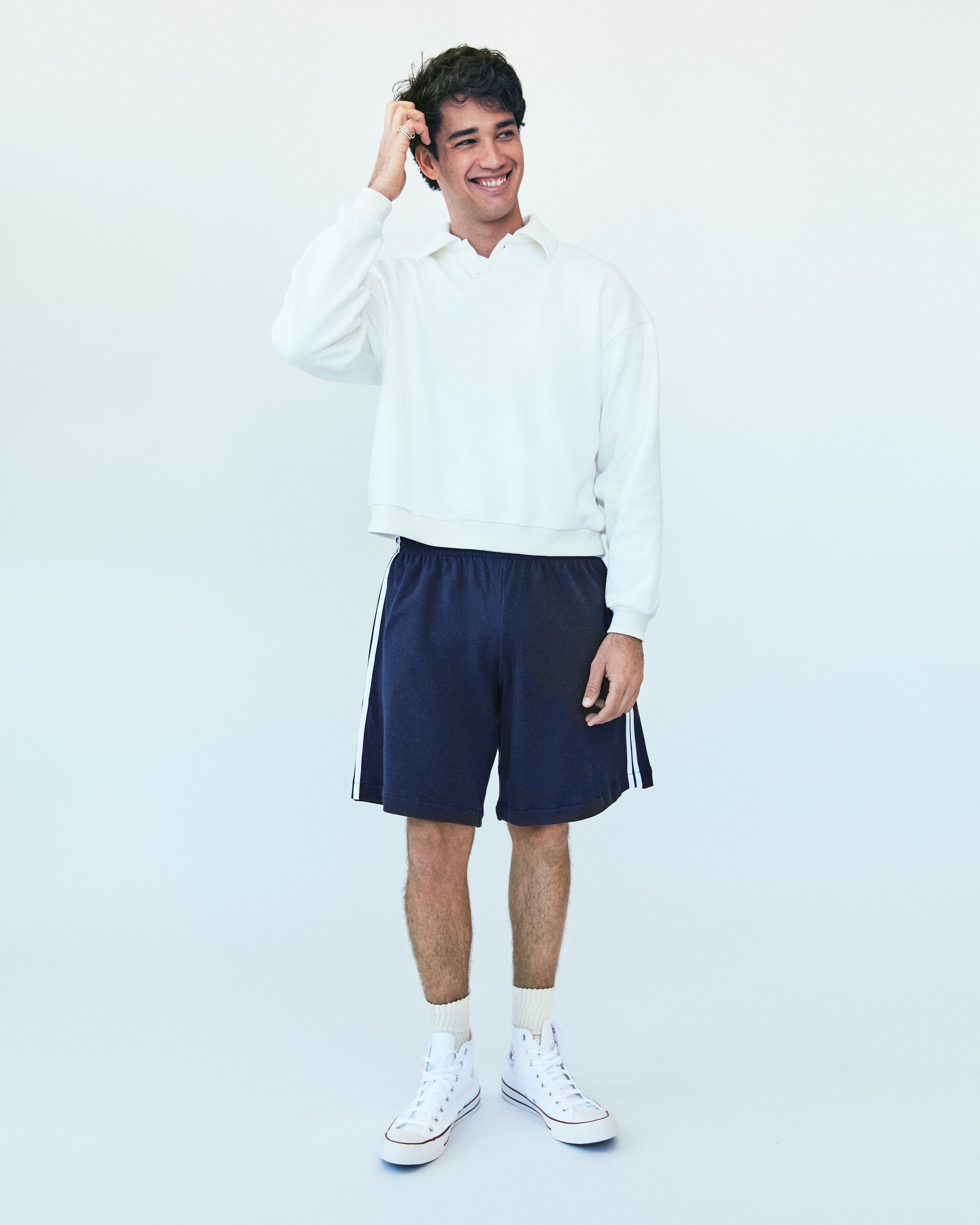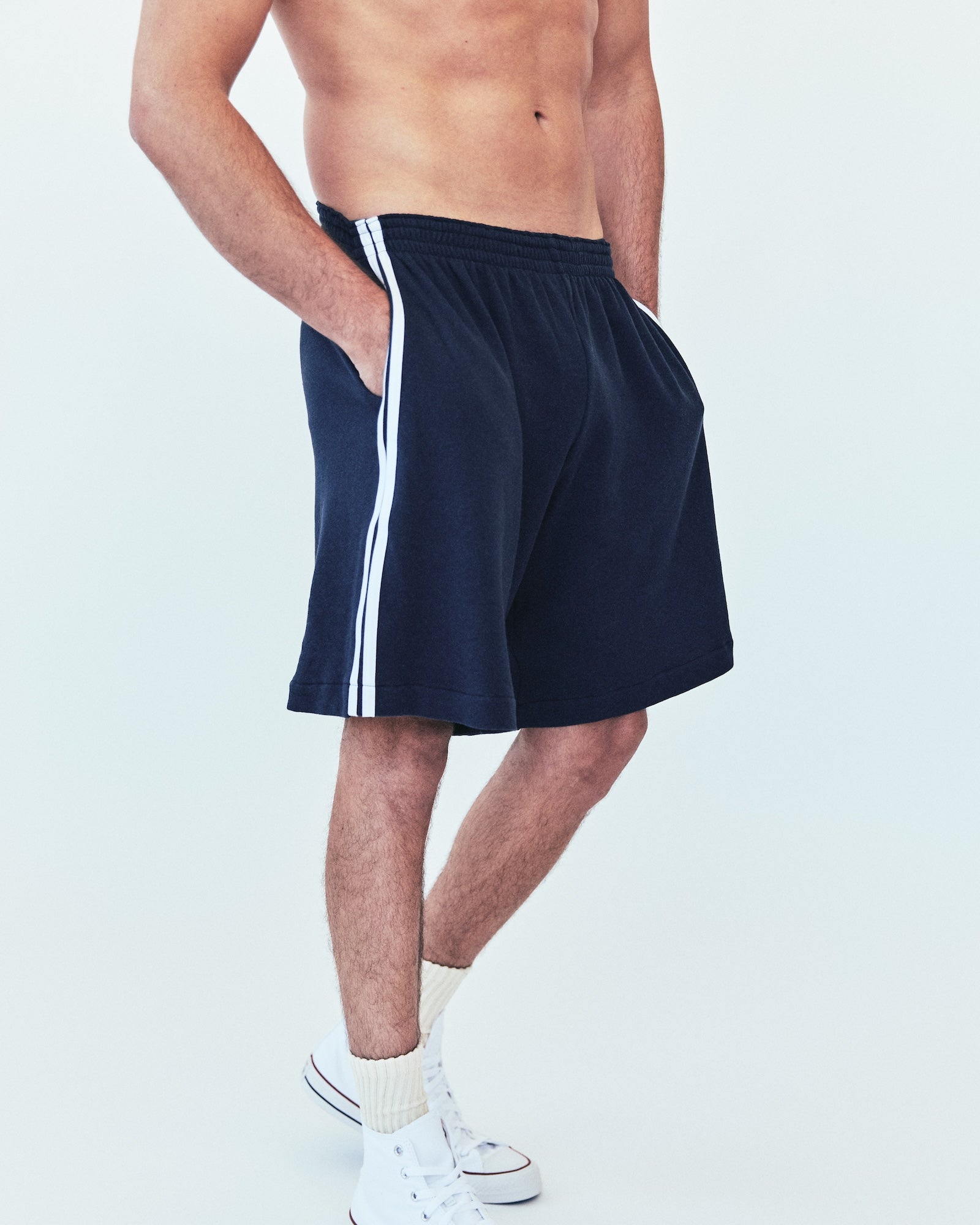- The Long Short, made from 100% Japanese Terry cotton, in navy with white stripes